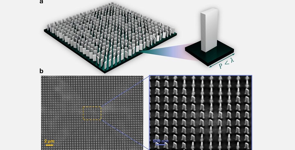 Kuva: Ensimmäinen (a) konseptikuva optisesta metapinnasta, (b) skannaava elektronimikroskooppinen kuva metapinnasta, jonka on valmistanut Tampereen yliopistossa Linzhi Yu.