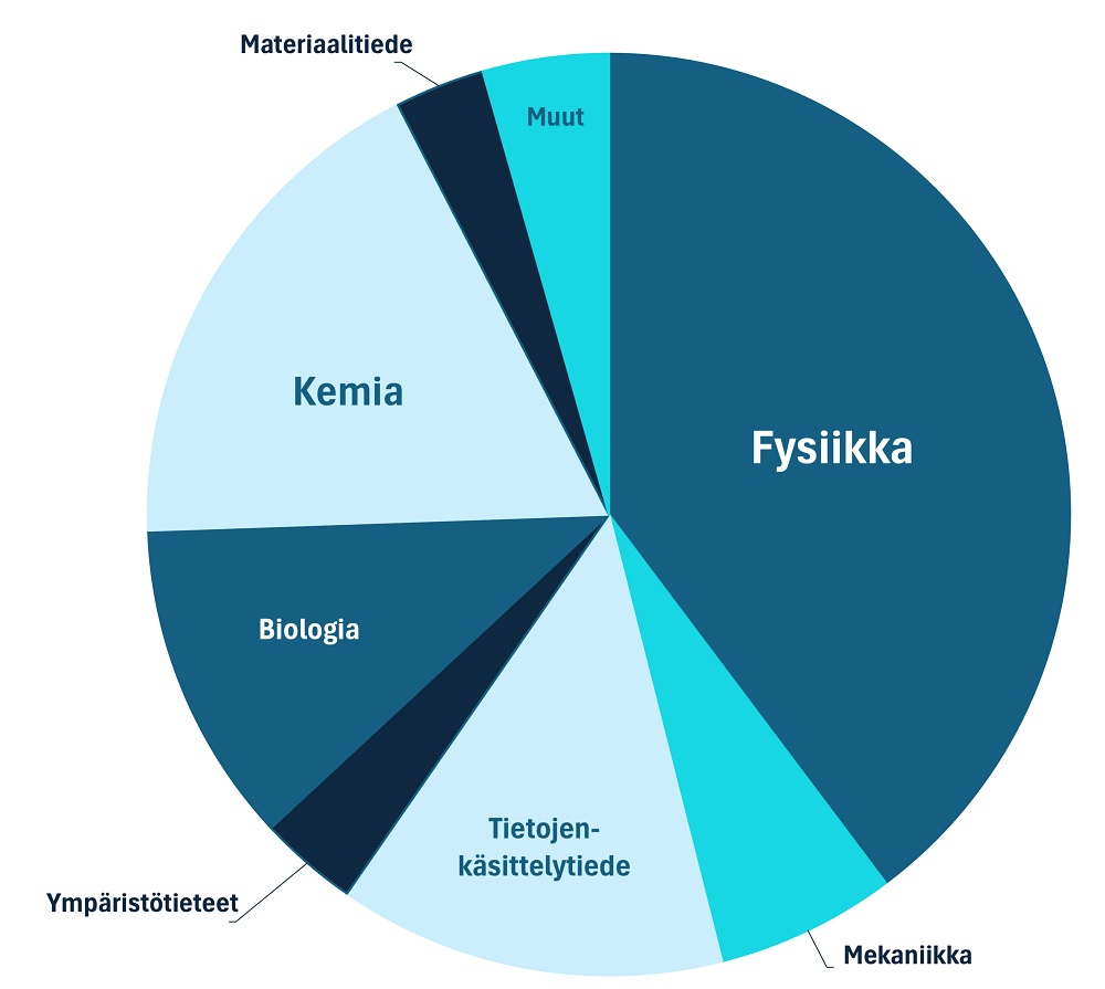 Kaavio näyttää, miten eri tieteenalat ovat suhteellisesti edustettuina yli 280 tieteellisessä artikkelissa, joissa on hyödynnetty LUMIn laskentatehoa syksyn 2022 ja syksyn 2025 välillä.