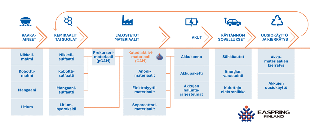 Easpring Finlandin Kotkan tehtaalla tullaan valmistamaan jauhemaista katodiaktiivimateriaalia (Cathode Active Material eli CAM), jota tarvitaan akkukennon arvokkaimman osan, katodin, valmistukseen.  Materiaalia hyödynnetään litiumioniakkujen kennoissa esimerkiksi sähköautojen akuissa.