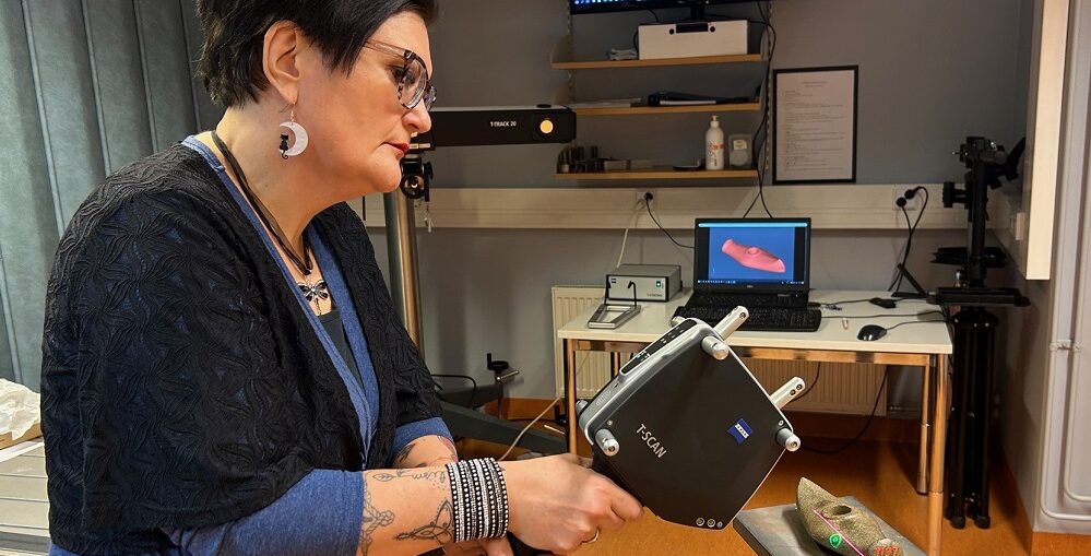 Aloituskuva: Tutkija Heidi Piili digitoi esohistoriallisen ajan vasarakirvestä Turun yliopiston kone- ja materiaalitekniikan laitoksella. Skannatun mallin tarkistuksen ja korjausten jälkeen siitä voidaan tulostaa oikean tyylinen 2D-malli. Kuva: Henry Ward-Raatikainen