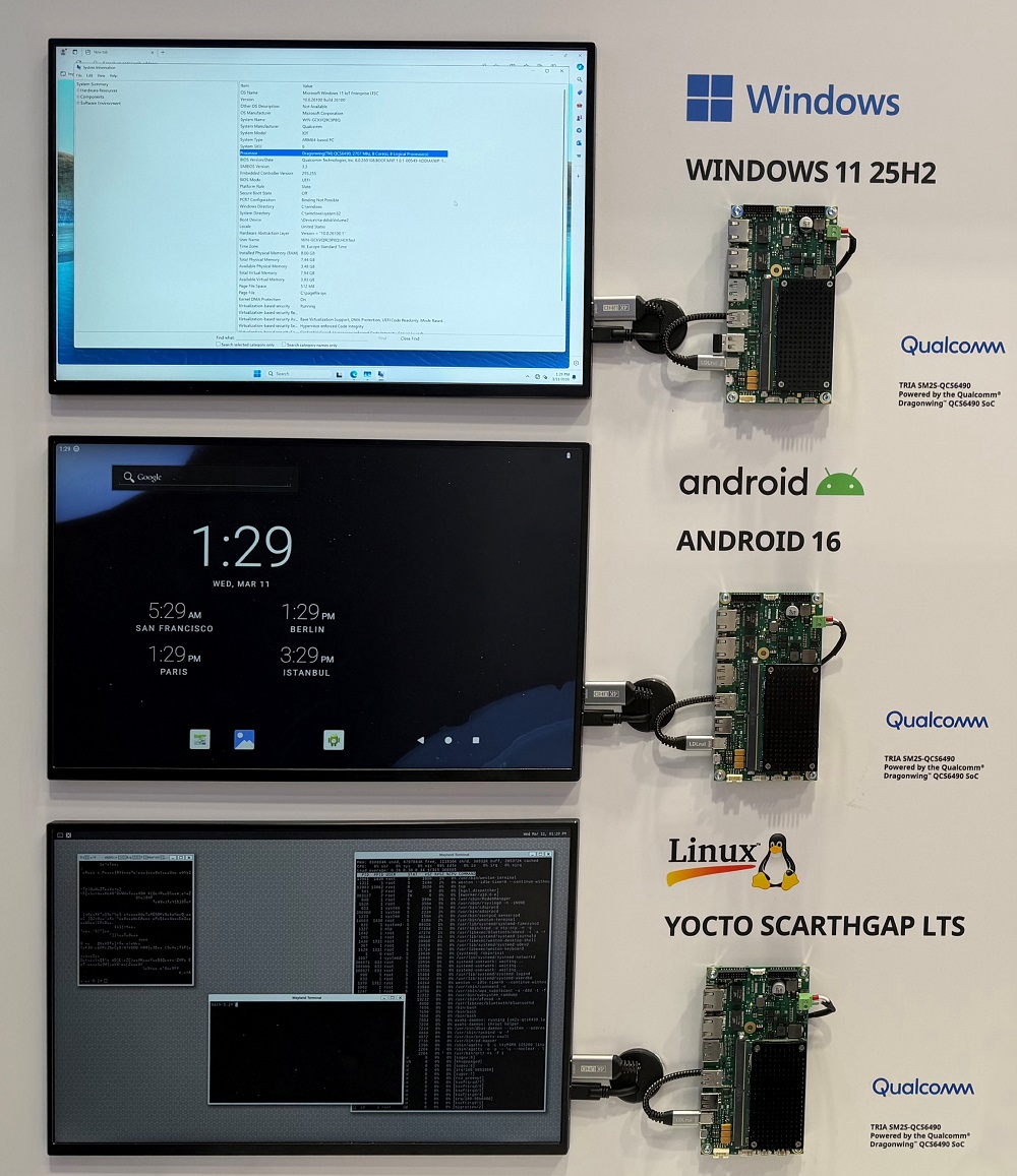 Korttivalmistaja Tria Technologies tuo Qualcommin Arm-pohjaiselle ohjainkortilleen tuen Androidin lisäksi Windows 11:n ja Linuxille. Tuettuja ovat Yocto Linux, Windows 11 IoT ja Android 13 ja loppuvuodesta myös Android 16.